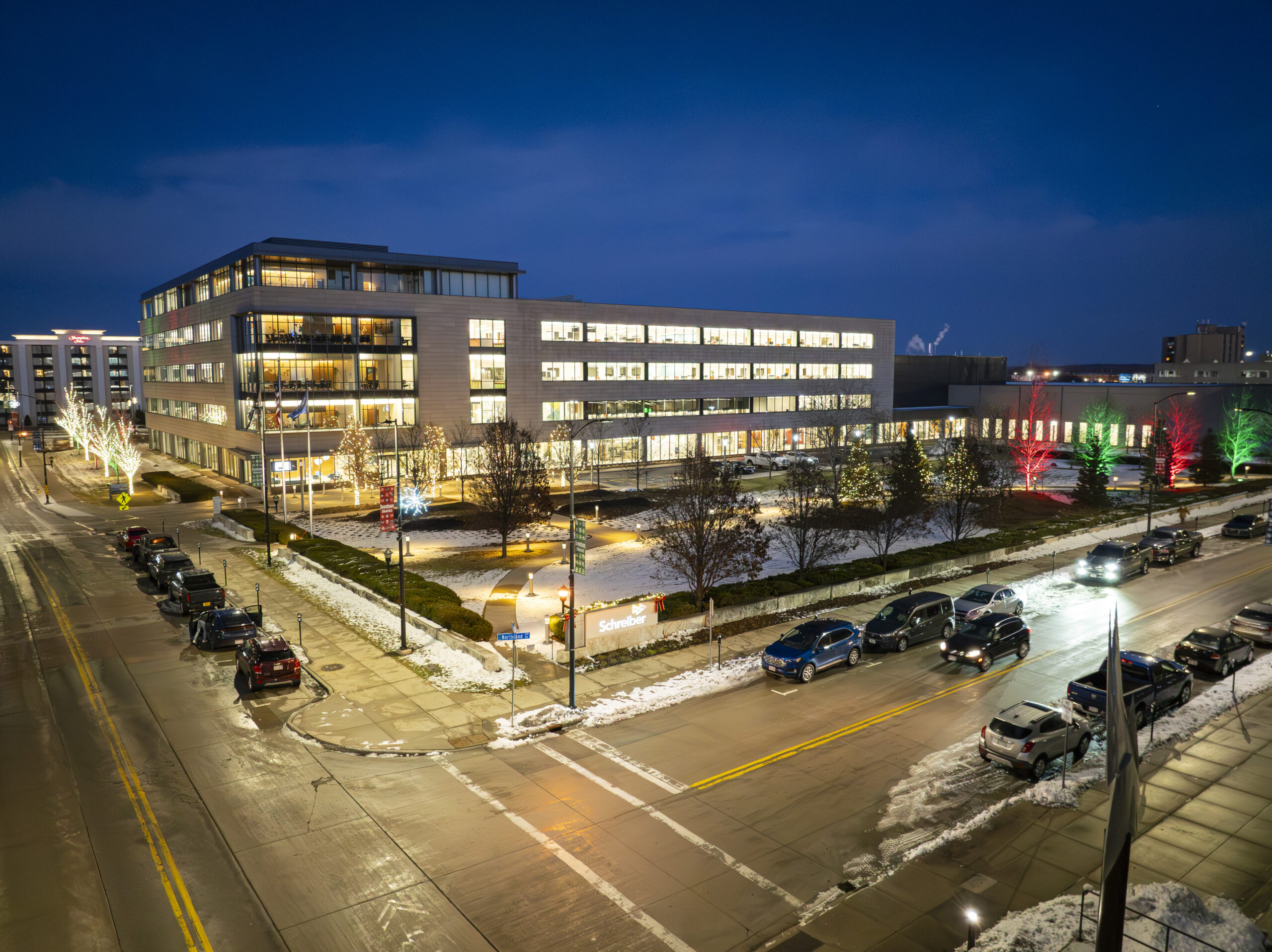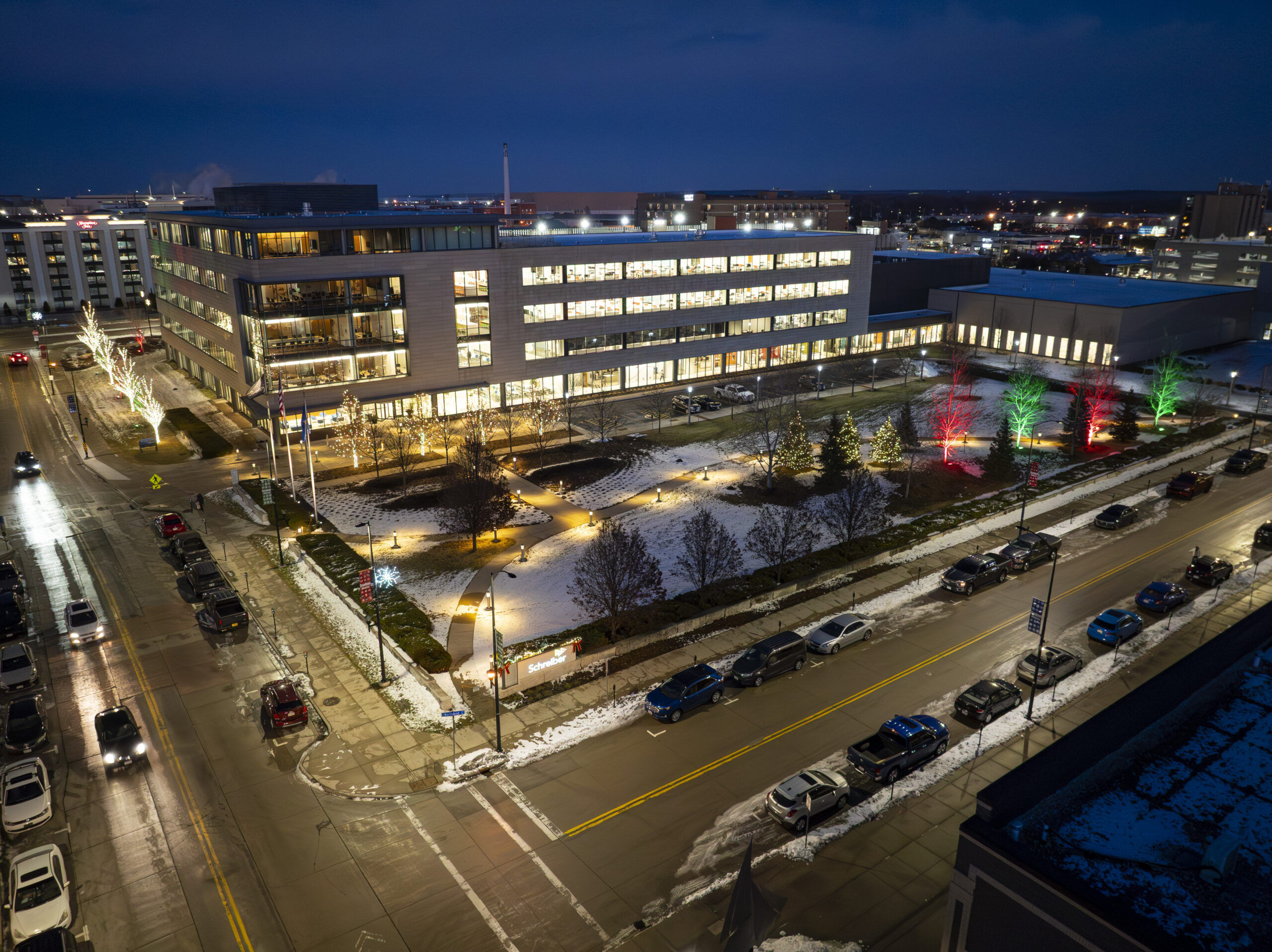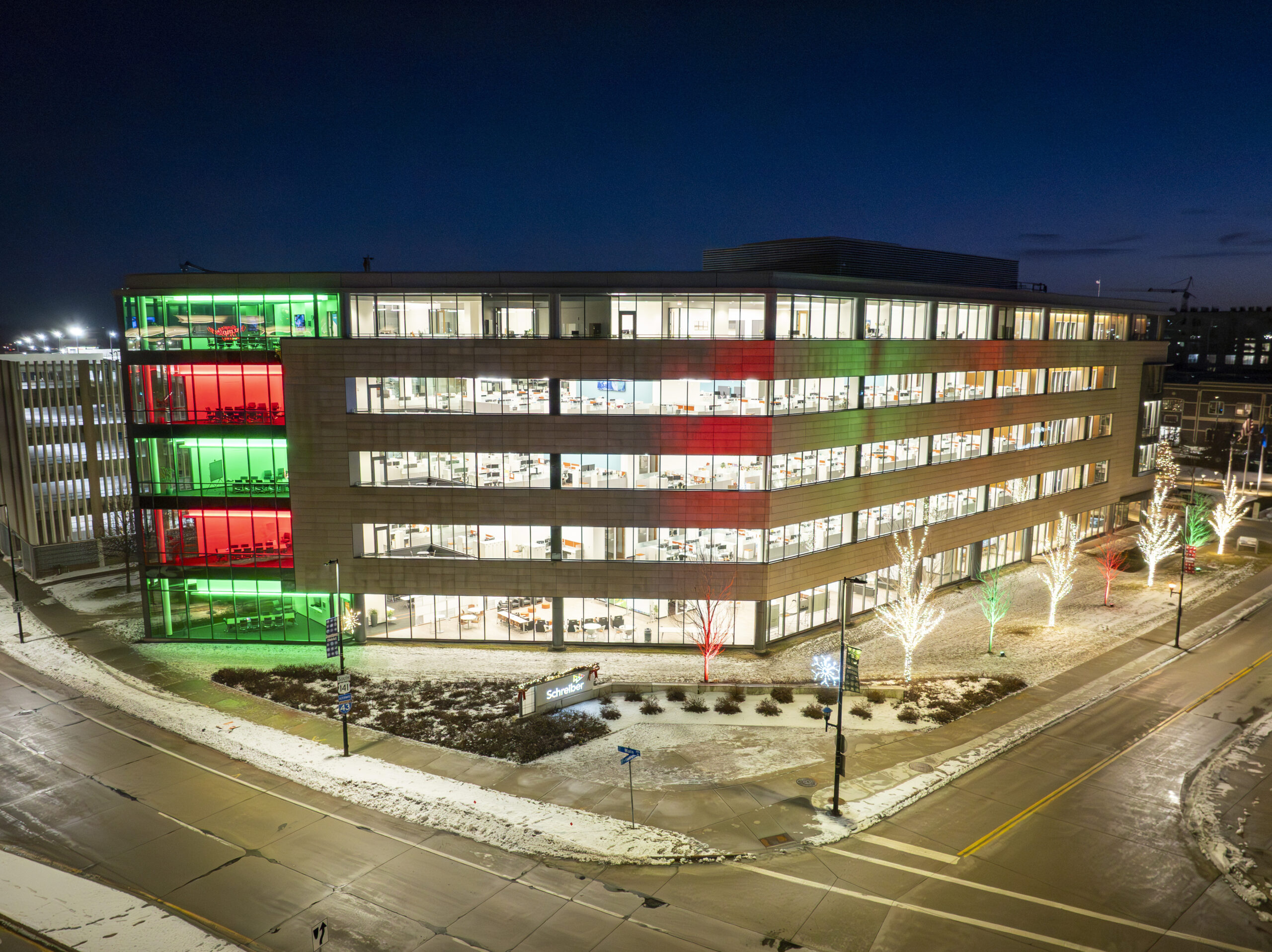 For this commercial project in Green Bay, our team enhanced the Schreiber Foods campus by illuminating three distinct areas of the property. We focused on the large “park-like” space adjacent to the building, the main entrance area, and a smaller section at the rear designed specifically for employee visibility. The goal was to create a cohesive holiday atmosphere that could be enjoyed by both the public passing by and the staff working inside. By strategically placing lights across these various zones, we were able to highlight the impressive scale of the corporate headquarters while adding a festive touch to the winter landscape.