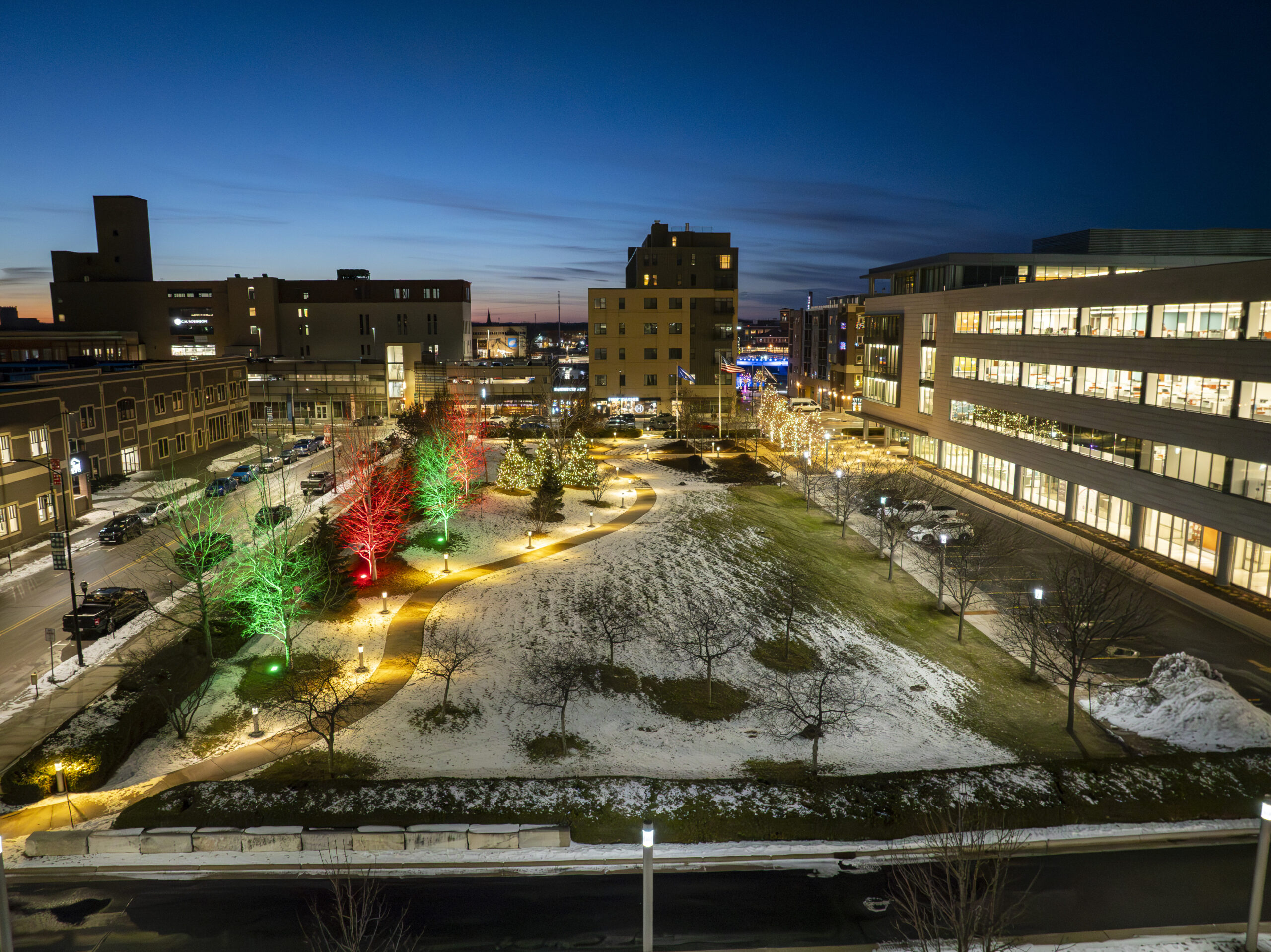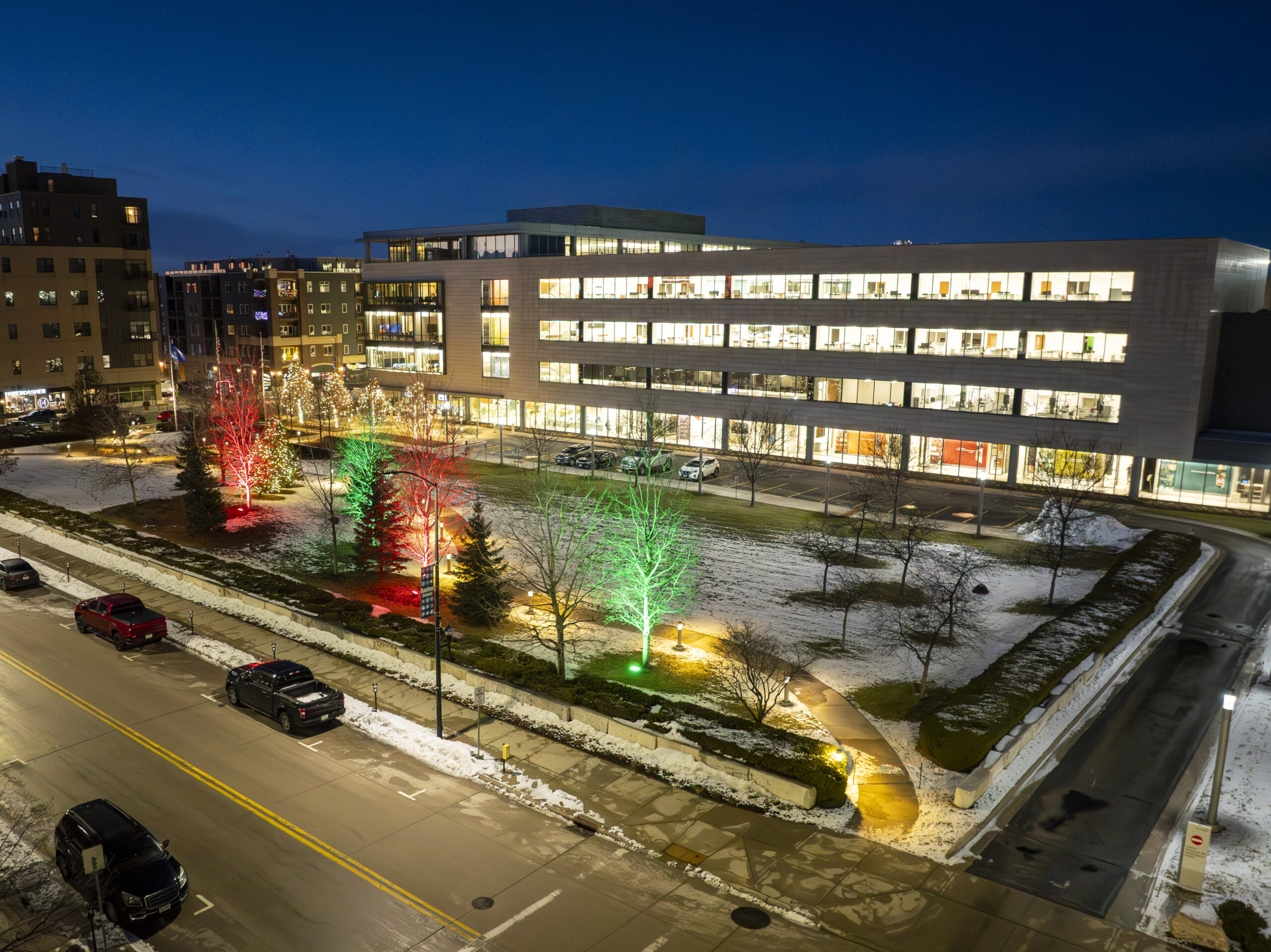 The installation featured a combination of traditional wrapping and high-powered color displays. We utilized warm white lights to meticulously branch wrap and canopy wrap 12 trees across the grounds for a classic, shimmering effect. To add a vibrant pop of holiday color, we installed large, powerful flood lights to bathe an additional 8 mature trees in bright red and green. These flood lights are strong enough to project color onto the building’s facade, illuminating the structure up to four stories high. This blend of detailed tree wrapping and bold architectural lighting creates a brilliant nighttime presence that stands out in the heart of the city.